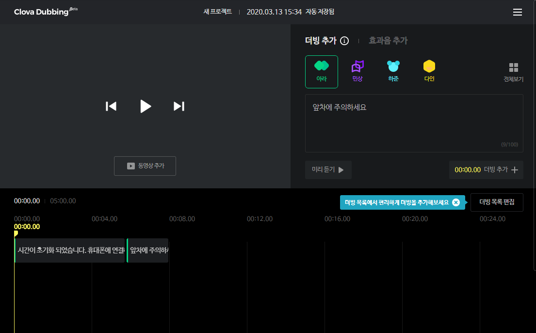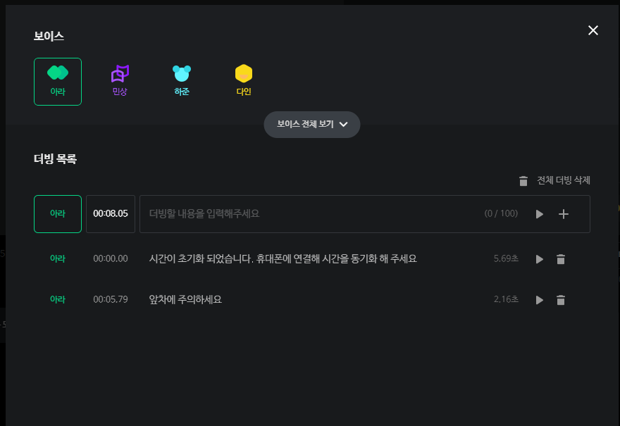 마침 네이버의 경우 클로바 더빙이라는 이름으로 개인이 무료로 텍스트를 음성으로 변환할 수 있는 기능을 지원하고, 변환할 스크립트도 30개 정도에 불과하니 그냥 이걸 이용해 웹에서 음성을 전환했습니다.